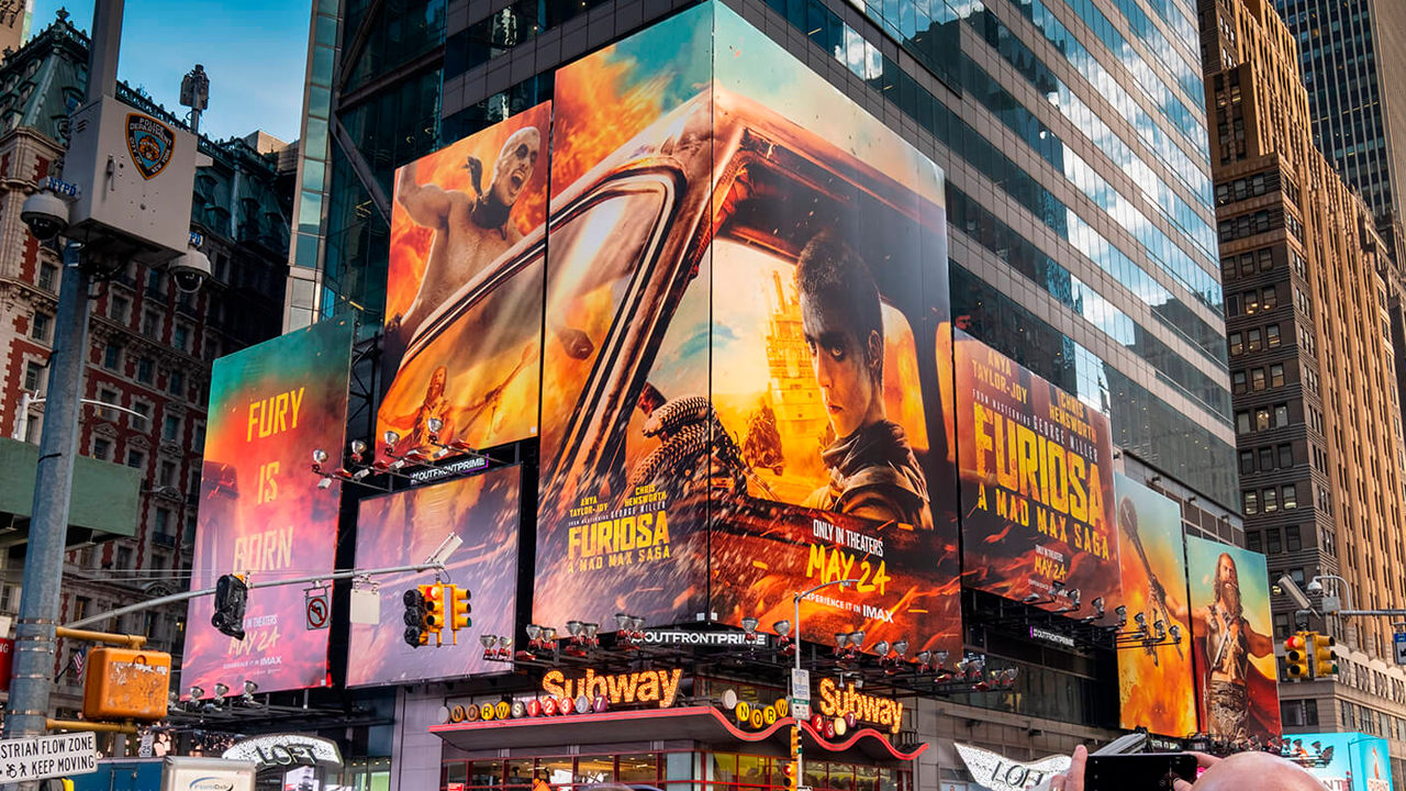 "Furiosa: A Mad Max Saga" was showcased in Times Square, New York City, to promote the film's theatrical debut on May 24, 2024. These billboards formed a key part of the movie's marketing strategy.